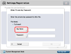 You can install a key pair file from a computer in order to perform the following: To use encrypted SSL communication for IPP printing, e-mail and I-faxes, the Remote UI, MEAP functions via a Web browser, device information delivery, and the Advanced Space which is opened externally as a WebDAV server; to use the SMS management function of MEAP; and, to confirm Department IDs and PINs.