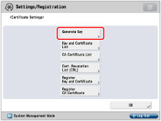 Press [Key and Certificate List] → [Key and Certificate List for This Device].