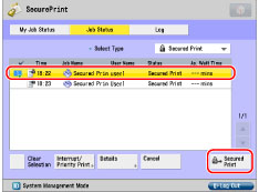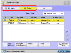 If you are logged on as the SSO-H administrator, jobs sent by all users are displayed, and you can view the details of or cancel the jobs. However, secured documents and encrypted secured documents can only be printed by the user that sent them.