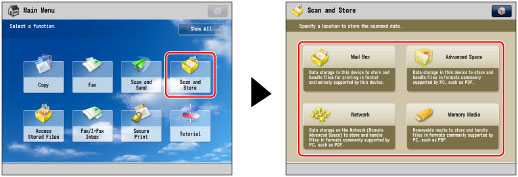 To scan the original and store it, press [Scan and Store] on the Main Menu screen → specify the location to store the scanned data.