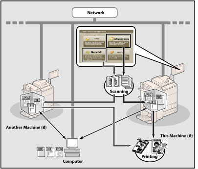 By selecting the Advanced Space of another imageRUNNER ADVANCE series machine from [Network], you can scan a document with this machine, and store it in the Advanced Space of the other imageRUNNER ADVANCE series machine. You can also use this machine to print files stored in another imageRUNNER ADVANCE series machine on the network.