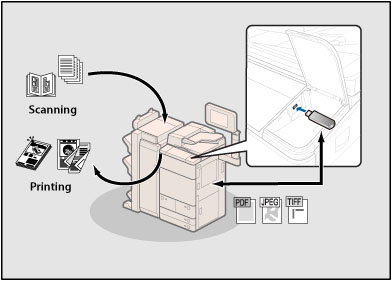 Memory media is a storage location that can be used by connecting USB memory to the USB port of the machine. You can scan a document with this machine and store it in memory media in various file formats that can be used on your computer. You can also print files stored in memory media on this machine at any time with your desired print settings.