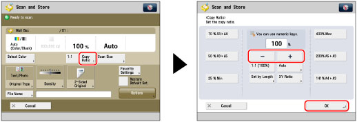 Press [Copy Ratio] → adjust the zoom ratio using [-] and [+] → press [OK].