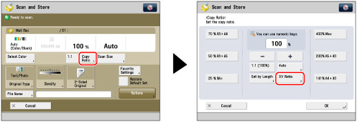 You can enlarge or reduce originals by any zoom ratio in 1% increments. The available zoom ratios are from 25% to 400% for the Mail Box function, and from 50% to 200% for the Advanced Space, Network, or Memory Media function. The same zoom ratio is used for the horizontal and vertical axes.