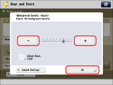 If you adjust the background density by pressing [Adjust] for <Background Density>, the [Auto] setting is cancelled. Similarly, if you press [Auto] while making manual adjustments in [Adjust], your adjustments are cancelled. The machine automatically adjusts the density to match the background.