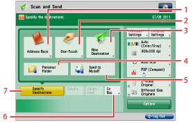 Displays the screen for registering/specifying one-touch buttons. Press [To Remote Add. Book] to specify destinations registered in the one-touch buttons of a server machine by accessing from a client machine on the network. For more information, see "Specifying Destinations from the One-Touch Buttons of a Server Machine."