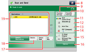 Press to specify your own e-mail address as the destination. The administrator can restrict general users to send e-mail only to their addresses. (See "Setting Limited Destination for Sending E-Mail.")