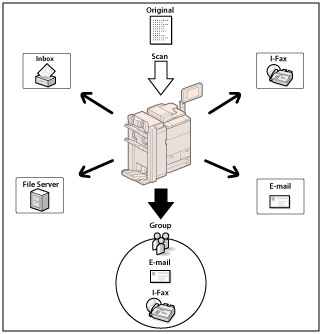 (E-Mail), (Fax), (I-Fax), (File), or (Group) destinations for each type appear. |