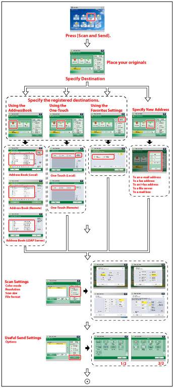 Press to select and use other modes available for scanning and sending. Set useful send functions such as sending different sized originals together or sending 2-sided originals.