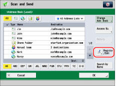 The first character that you enter for the name is used for sorting the destination list when you press keys, such as [ABC], [DEF], and [GHI], on the Address Book screen. If [Search by Name] is pressed on the Address Book screen, a screen for narrowing the search in the Address Book appears.