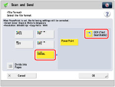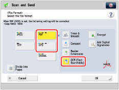 If you select PDF or XPS as the file format, you can set [Compact] and [OCR (Text Searchable)] at the same time. In that case, [PDF (Compact)] or [XPS (Compact)] is displayed as the file format on the Scan and Send Basic Features screen.