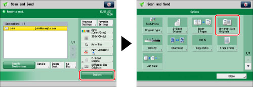 Specify the destination → press [Options] → [Different Size Originals].