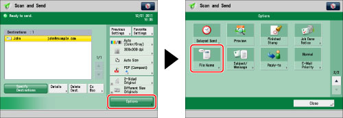 If you Divide into Pages: The file name is composed of the file name as entered, the year, month, day, hour, minute, and second the file is sent, and five digits that represent the page number of the image. Examples: file name_20120707203000_00002.tif file name_20120707203000_00002.jpg file name_20120707203000_00002.pdf file name_20120707203000_00002.xps If you do not Divide into Pages: The file name prefix is generated by the file name and the year, month, day, hour, minute, and second the file is sent. Examples: file name_20120707203000.tif file name_20120707203000.pdf file name_20120707203000.xps If you do not set the file name: