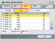 Displays detailed information for the selected job. Check the detailed information → press [OK] to return to the Receive screen.