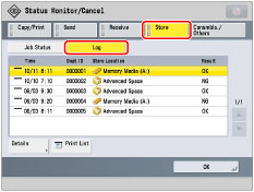 Displays detailed information for the selected job. Check the detailed information → press [OK] to return to the Store screen.