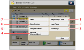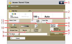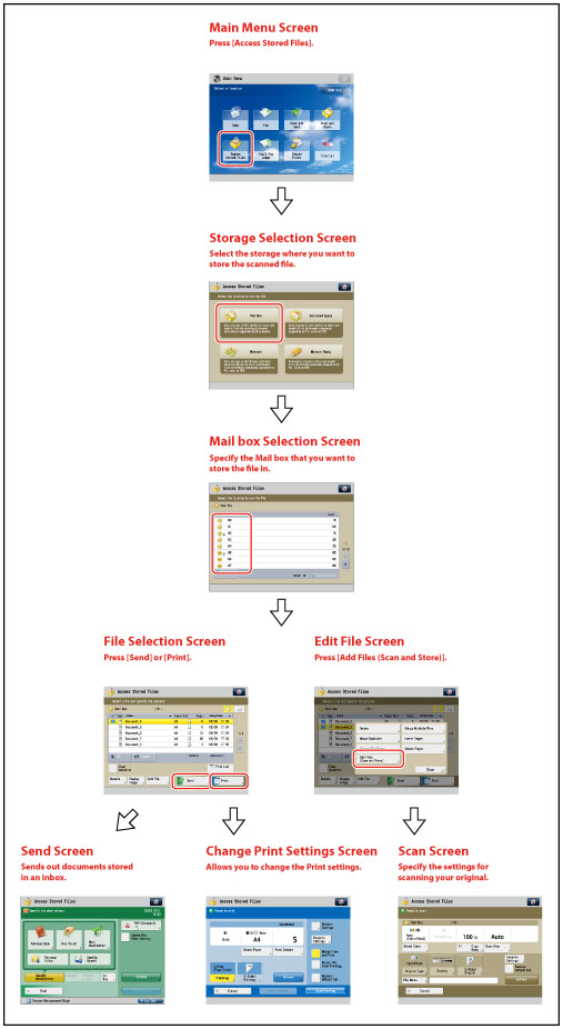 For the procedure regarding [Add Files (Scan and Store)] and instructions on operating the Scan screen, see "Adding a File (Scan and Store)" and "Flow of Scan and Store Operations."