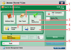 Displays the screen for registering/specifying one-touch buttons. Press [To Remote Add. Book] to specify destinations registered in the one-touch buttons of a server machine by accessing from a client machine on the network. For more information, see "Specifying Destinations from the One-Touch Buttons of a Server Machine." |