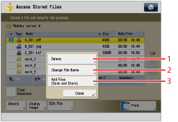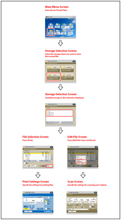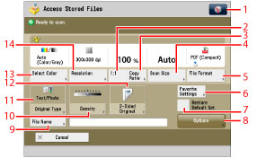 For the procedure regarding [Add Files (Scan and Store)] and instructions on operating the Scan screen, see "Adding a File (Scan and Store)" and "Flow of Scan and Store Operations."