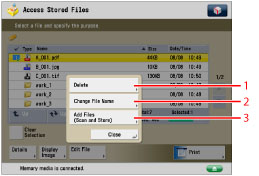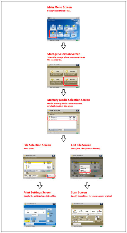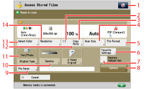 For the procedure regarding [Add Files (Scan and Store)] and instructions on operating the Scan screen, see "Adding a File (Scan and Store)" and "Flow of Scan and Store Operations."