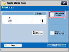 If you want to print a file stored in the machine from a computer or using [Store in Mail Box] of the Copy function with the settings that were set when the file was stored, do not print the file from the Change Print Settings screen. If you print the file from the Change Print Settings screen, the file may not be printed with the same settings that were set when the file was stored.