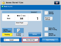 If you want to print files frequently with the same print settings, you can change the default print settings for [Access Stored Files]. For more information, see "Specifying the Stored File Settings."