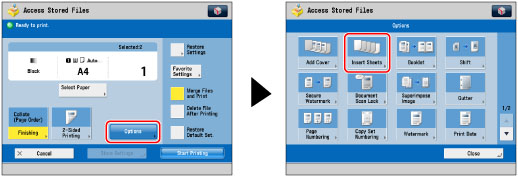Select [Sheet Inserter] for the sheet insertion tray to feed cover page from the Document Insertion Unit-K1. If you want to select the sheet inserter when a paper size/type is already set for the current or reserved job, you can press [Change Insert. Paper].