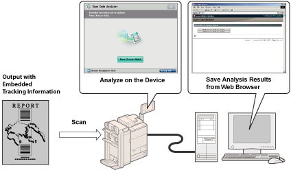 You can analyze embedded tracking information on the output, and find out who, when, and with which machine the document was output. The information analyzing tool is required to analyze tracking information. For more information, see "Document Scan Code Analyzer for MEAP."