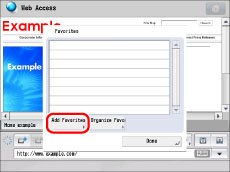 You can add frequently viewed Web pages to Favorites. Web pages registered in Favorites appear on the Main Menu screen as buttons. By adding a Web page to Favorites, you can easily access the Web page.