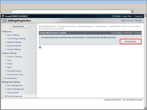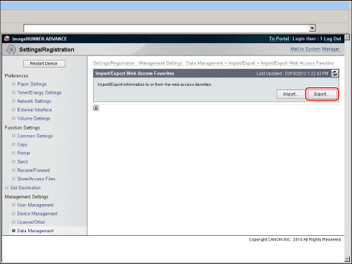 Click [Web Access Favorites] for <Import/Export Individually> → [Export...].