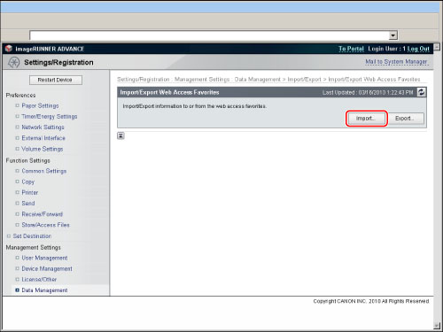 Click [Web Access Favorites] for <Import/Export Individually> → [Import...].