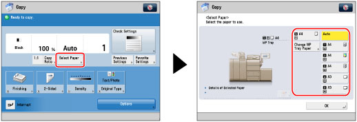 Icons indicating the type of paper loaded in each paper drawer can be displayed on paper selection screens, if you store that information into the machine beforehand. (See "Registering/Editing Custom Paper Types.")