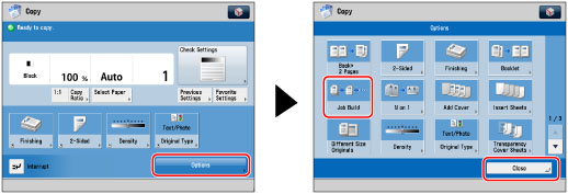 You can change or specify the following settings before scanning the next batch of originals (i.e., between batches): the number of copies, 2-Sided Original mode, original type, and copy exposure. However, if you specify the Image Combination mode together with the Job Build mode, you cannot change the copy exposure and original type.