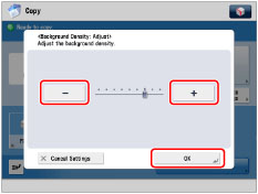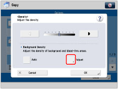 If you adjust the background density by pressing [Adjust] for <Background Density>, the [Auto] setting is cancelled. Similarly, if you press [Auto] while making manual adjustments in [Adjust], your adjustments are cancelled. The machine automatically adjusts the density to match the background.
