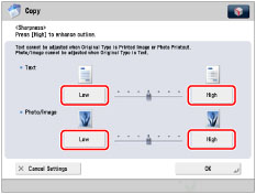 To copy text or lines clearly, the setting should be towards [High] for the Text area. To copy originals containing printed photographs or other halftones, the setting should be towards [Low] for the Photo/Image area.