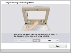 If originals are scanned using the feeder, there may be some cases in which the original cannot be scanned properly, or streaks appear on the copies. In this case, clean the original scanning area by following the directions displayed in [Original Scanning Area Cleaning Method] in [Adjustment/Maintenance] (Settings/Registration).