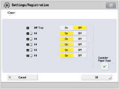 If you set [Consider Paper Type] to 'On', paper is not fed from another paper source when the original paper source runs out of paper, unless another paper source is loaded with paper of the same size and type. For more information on stored paper types, see "Checking the Status of Consumables and Other Information."