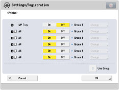 If you set [Use Group] to ‘On’, paper sources are set as a group. When the paper source specified in the printer driver runs out of paper during printing, the machine automatically selects another paper source in the same group, and continues printing.