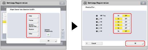 If the selected paper source runs out of paper during a copy job, another paper source with the same paper type is selected as the result of Auto Drawer Switching. If you set to ‘On’, paper sources with different paper types are not selected even when the paper source are loaded with the same paper size.
