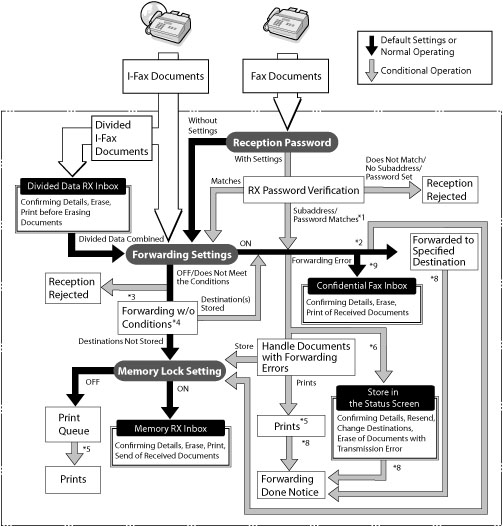 *2 If you set <Store/Print Received File> to 'On' in [Forwarding Settings] in [Function Settings] (Settings/Registration), forwarded files are either printed or stored in the Memory RX Inbox.