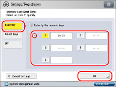 If you select [Everyday], select a number ([1] to [5]) → enter the start time using