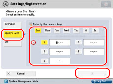 If you select [Specify Days], select a day of the week ([Sun] to [Sat]) → select a number ([1] to [5]).