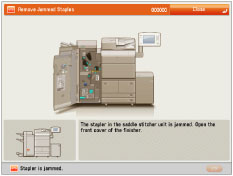If a staple jam occurs, a screen indicating the location of the staple jam and how to clear the jam appears on the touch panel display. Follow the instructions on the screen to clear the staple jam. The screen is displayed repeatedly until the staple jam is cleared. If you press [Close], you can continue operations, such as setting modes or scanning originals, even if the jammed staple is not removed immediately.