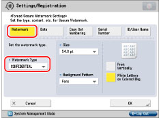 For instructions on entering characters, see "Entering Characters from the Touch Panel Display." If you have registered characters in [Register Characters for Page No./Watermark] in [Function Settings] (Settings/Registration), you can select the characters from the list.