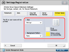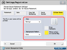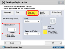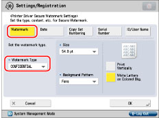 If you want to use the Secure Watermark function for each job from the printer driver, on the [Printing Preferences] dialog box, click the [Finishing] tab → [Advanced Settings] → select [On] for [Secure Printing Function of Devices]. For more information, see the on-line help for the printer driver.