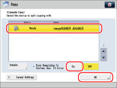 Select the printer to use as the cascade copy printer → select [On] for <Pass Remaining To Partner Dev. If Error> → press [OK].