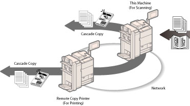 If a cascade copy printer (imageRUNNER ADVANCE 8205 PRO/8295 PRO/8285 PRO) is connected to the network you are using, you can copy using the machine and the cascade copy printer. By printing originals scanned by the machine from the machine and a cascade copy printer at the same time, you can efficiently process large copy jobs.