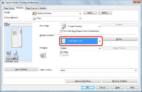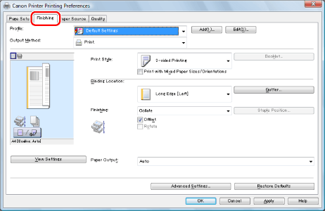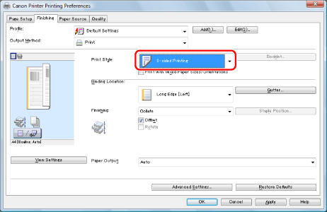 The default setting for [Print Style] is [2-sided Printing]. You can also change the default setting to [1-sided Printing]. For instructions on changing the default settings, see "Configuring the Default Print Settings."