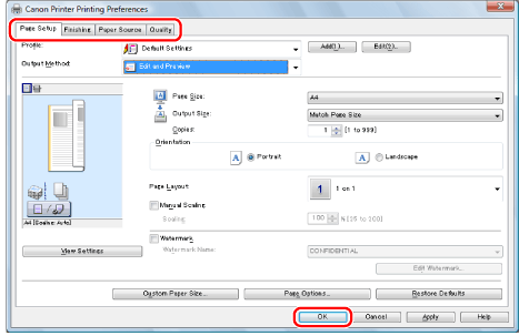 Click the tabs for the [Page Setup], [Finishing], [Paper Source], and [Quality] tabs, and then specify the desired items.