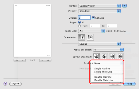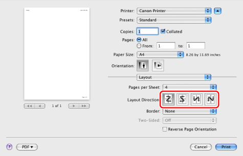 Select your printer → [Layout] →the number of pages you want to print onto one sheet of paper from [Pages per Sheet].