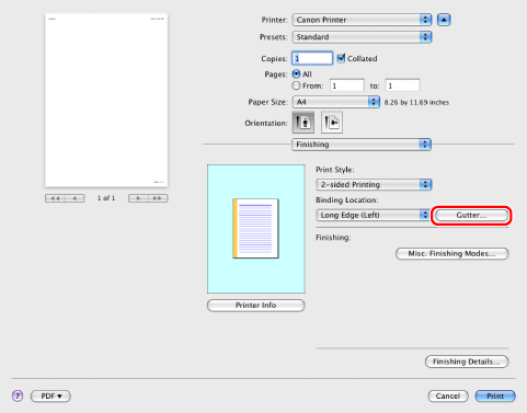 The default setting for [Print Style] is [2-sided printing]. You can save the 1-sided printing setting as a preset. For details, see "Using [Presets] for Printing."